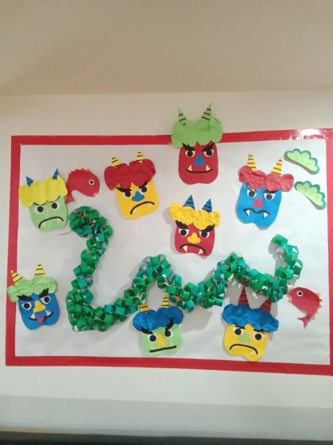 2月の節分の行事の前に鬼の面を利用者様に作って頂きました