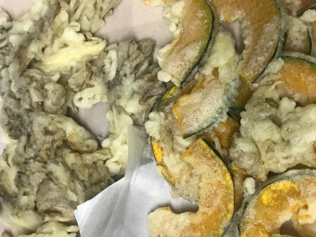 揚げ物が食べたいの一言で天ぷらそばにしました。秋らしくまいたけとカボチャです。