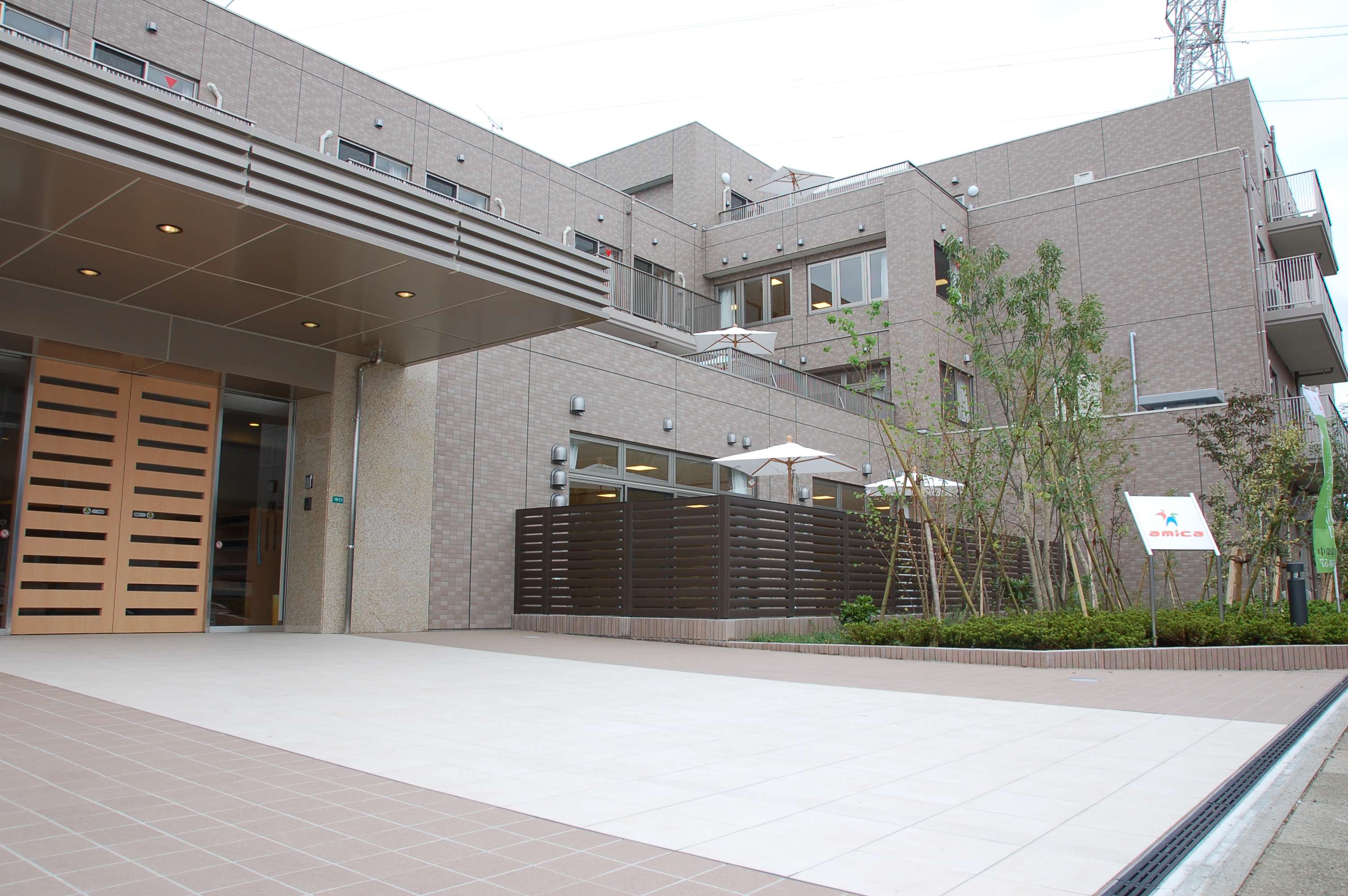 住宅地に立地する明るく、日あたりの良いホームで中庭もあります。