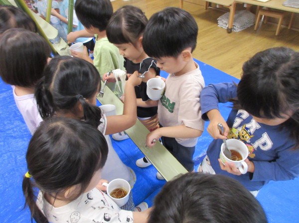 8月、昨年度の夏に絵本献立として行った『流しそうめん』が子ども達に好評で「つぎのなつもやりたい!」と、昨年度からリクエストされていたので、夏の恒例行事に出来たらと、今年度も取り入れました。