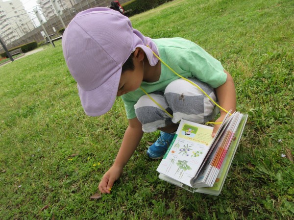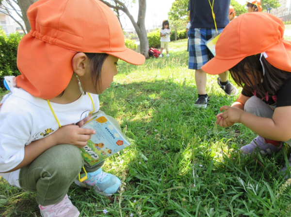 お散歩先の公園では草花や昆虫等の季節の自然物を見つけ、みんなで興味深く観察しています。幼児組は月刊誌の付録の個人の図鑑を持って行き、新しい発見や疑問をその場で調べて「これは〇〇っていうんだよ」等と嬉しそうにお友達や保育者にお話しする姿が見られます。また、保育園に戻ると「今日はだんごむし見つけた!」「ちょうちょもいたよ!」と嬉しそうに報告してくれます♪