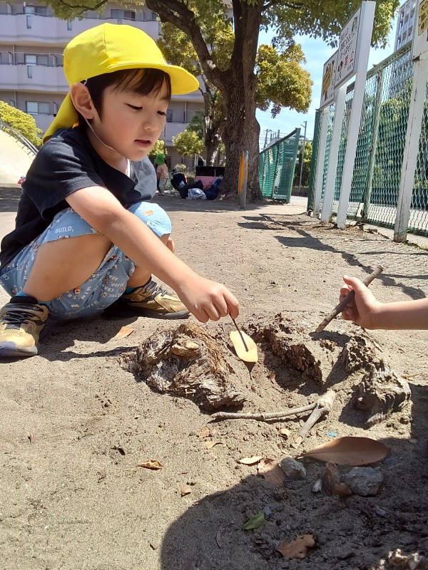砂遊び玩具だけではなく、身近なもの(小石や木の枝など)を工夫して遊びに取り入れ、見立て遊びやごっこ遊びなどを楽しむ子ども達。