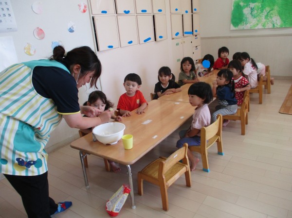 保育者が粉の状態からの目の前で作ってみせています。「なにができるの?」とみんな興味津々の様子( *´艸`)
