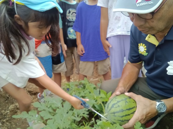 畑のスイカを収穫しました。