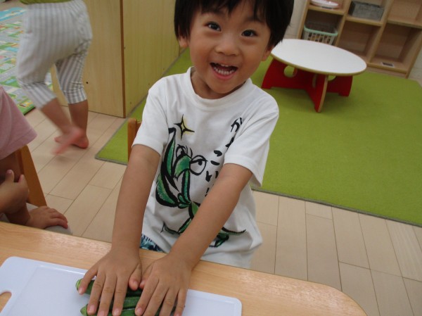 こどもの家・志木中宗岡 ぺんぎん組(3歳児) オクラの板ずりに挑戦!