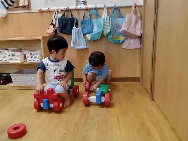 保育者が車を作ると嬉しそうにお部屋をドライブしたり、ぬいぐるみをのせたりして楽しんでいました。壊れてしまっても、すぐに保育者に助けを求めずに「自分で直してみよう」という気持ちが見られ、頑張って自分なりに考えながら修理していました。