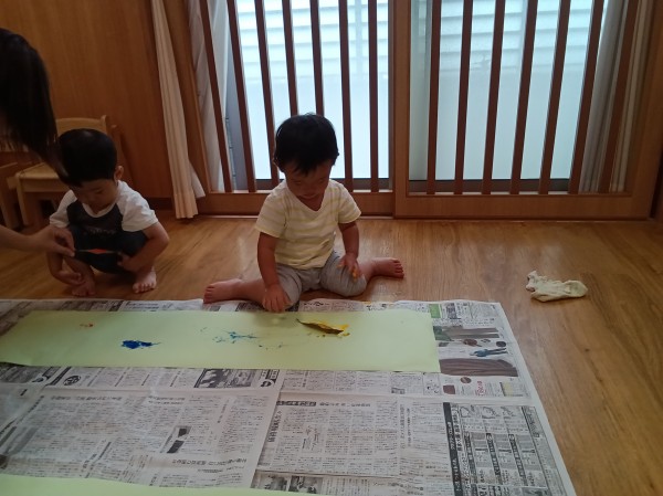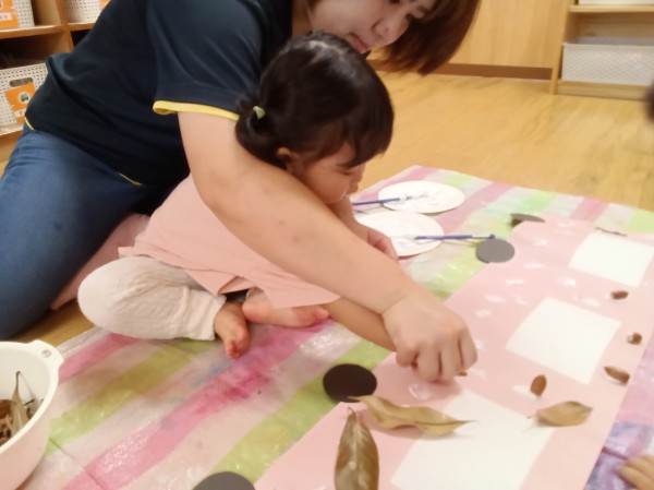 ドングリや葉っぱを貼り付けるチームと葉っぱに絵の具を着けて模造紙に色付けしていくチームの2つに分かれて、秋の自然物に触れていきました。葉っぱに絵の具が付くと不思議そうに見つめていた子どもたち。自由に模造紙に色をつけていき、好きな色を言いながら楽しんで遊んでいました。
