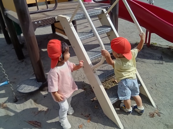 お友だちと向かい合って座ったり、遊具の階段の隙間からお友だちを見つけて「ばあ」と笑いあったりと、微笑ましい姿がたくさん見られました。
