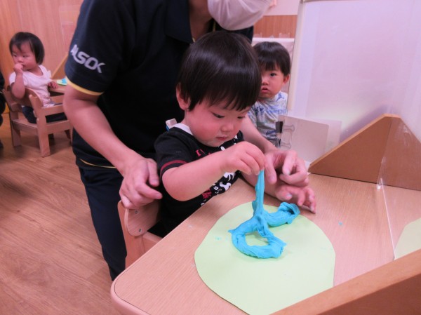 最初は寒天遊び同様、不思議そうに見ている子もいましたが、遊び始めると柔らかい感触が楽しく、集中して遊んでいました!