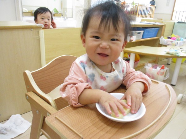 月に1回、食育として野菜などに触れているたまご組。今回はりんごに触ってみました!