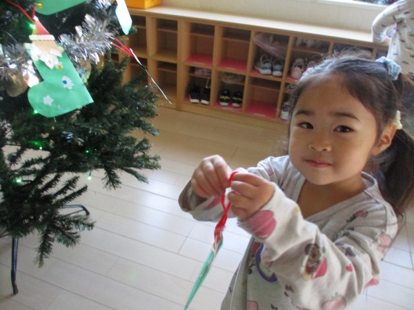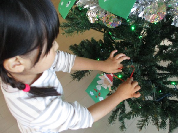 24日にクリスマス会があるのでツリーにオーナメントを飾りつけ