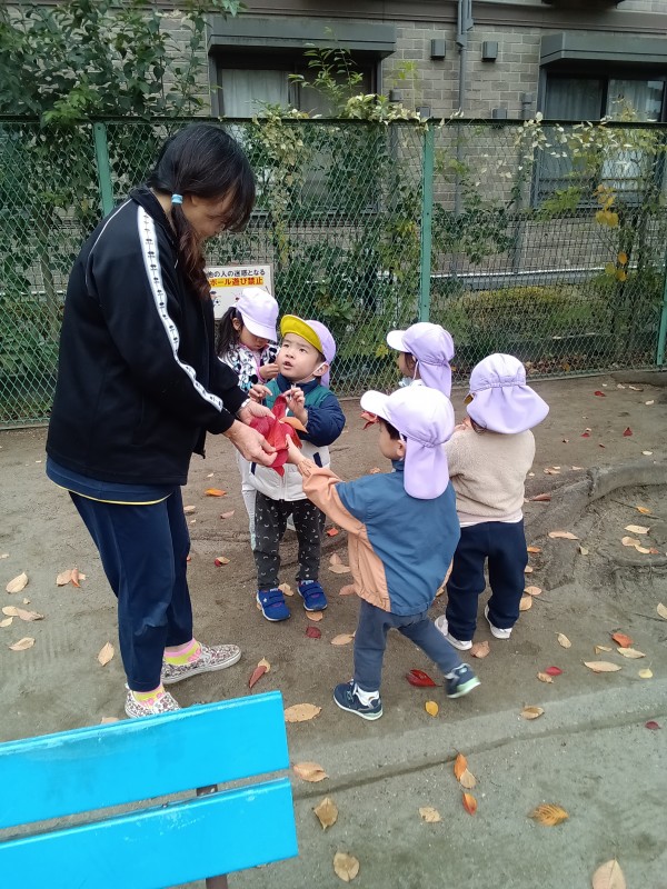 11月。保育園では、1日「紅葉狩り」の日を設け、各クラス散歩先の公園で紅葉狩りを楽しみました。