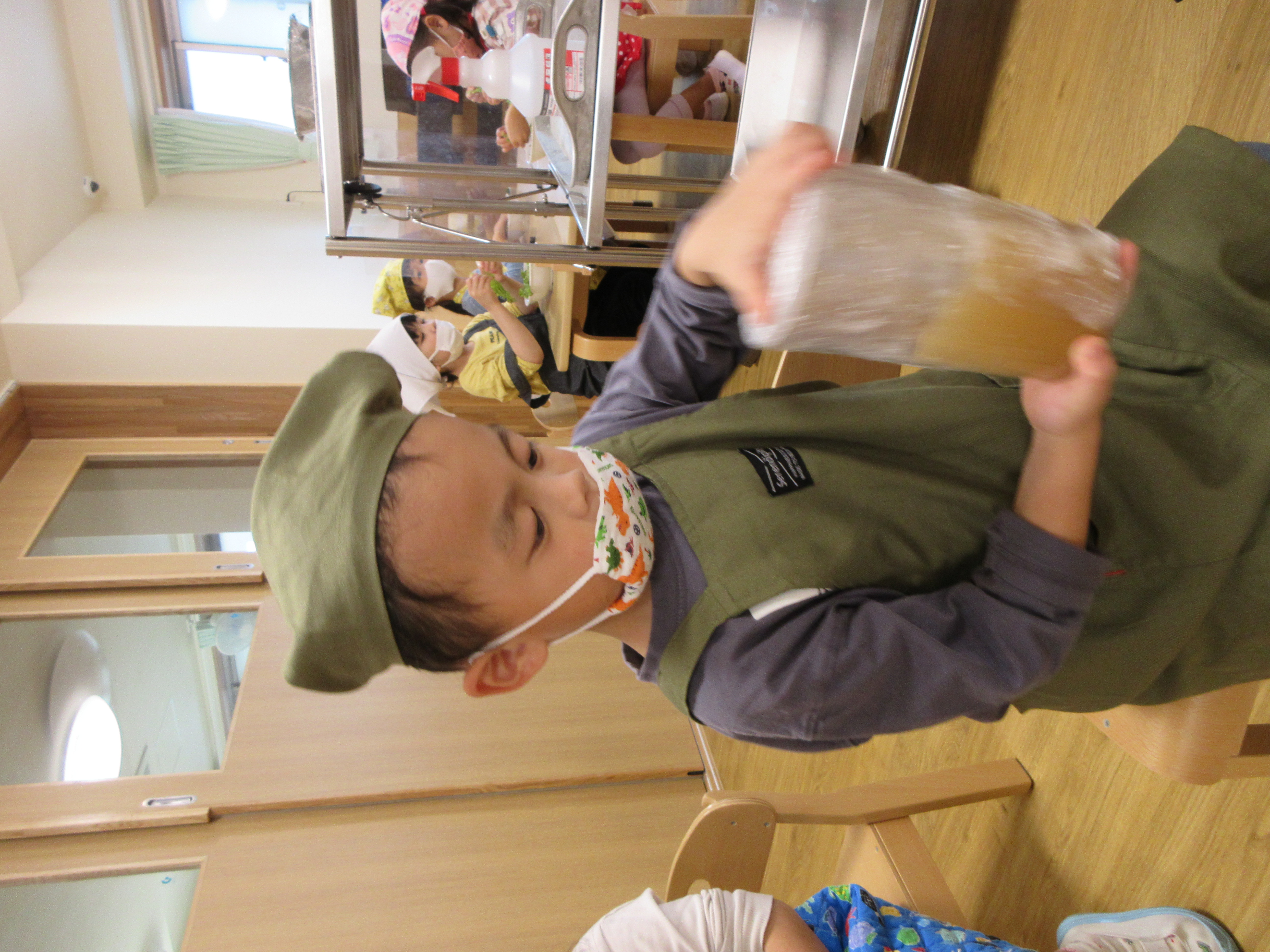 3歳児ぱんだ組はドレッシング作り、4歳児きりん組はレタスちぎりとカニカマ割き、5歳児ぞう組はキュウリを包丁で切りました。