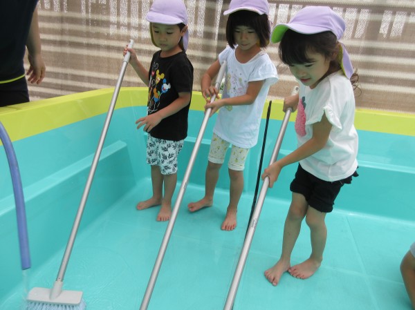 夏らしい厳しい暑さが感じられる今日この頃。3,4,5歳児幼児組のプール開きを行いました。