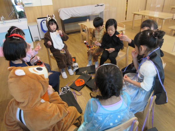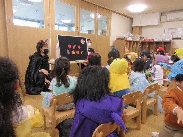 今日は「ハロウィン」ですね。保育園では、由来等が分かるようになる幼児クラスを対象にハロウィンの会を行いました。