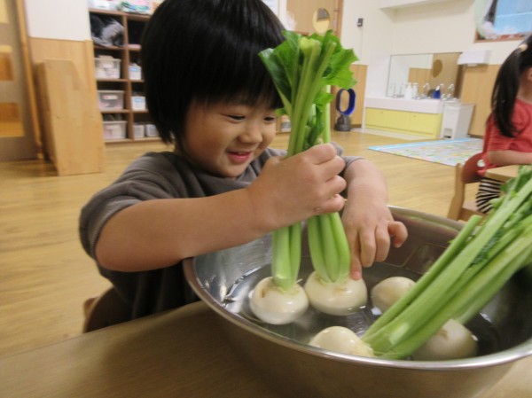 2歳児うさぎ組は、かぶを洗うお手伝いを行いました。