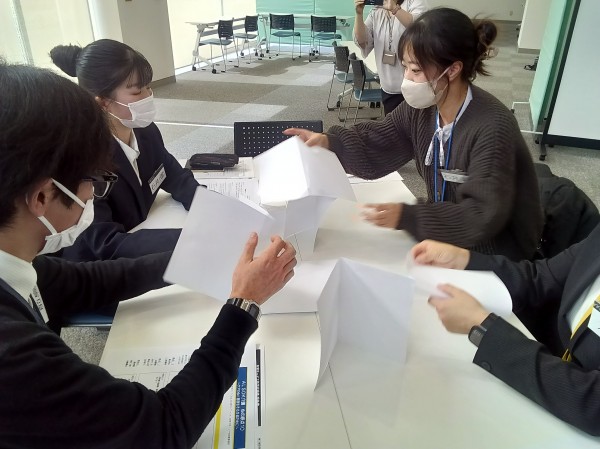 研修は、ペーパータワーやペーパーフリップ等チームワークを育むワークや利用者の尊厳の保持等