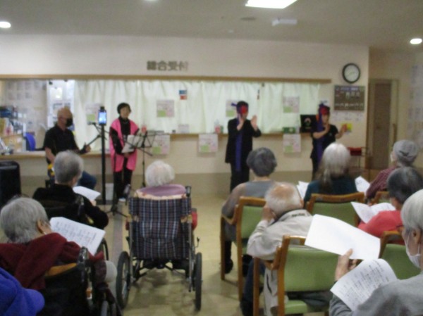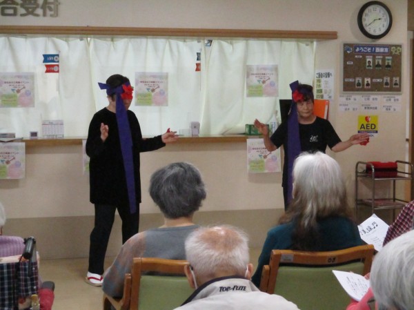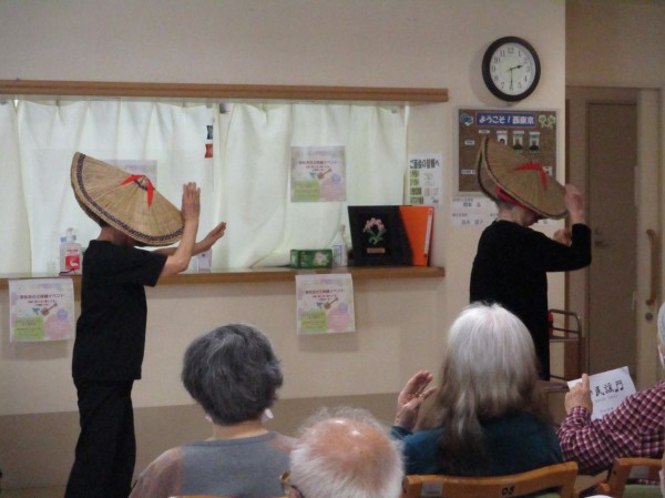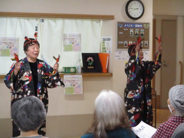 三味線と唄に合わせて踊って頂きました。曲によってはご利用者も一緒に上半身で踊っていらっしゃいました!花笠音頭や茶切り節、佐渡おけさ等全部で11曲唄って踊って頂きました。最後にアンコールで東京音頭を皆で踊りました!
