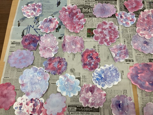 完成した紫陽花はよく乾かしてから葉っぱを付けて模造紙に貼り付けて各階に飾る予定です(^^)/