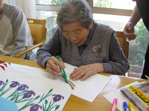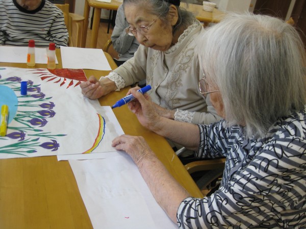 こんにちは! グループホームみんなの家・あきがせの介護ブログです!様子をお知らせいたします 今日はアヤメの貼り絵を行いました。そのご様子をお知らせいたします!