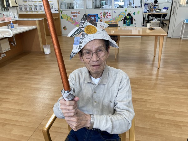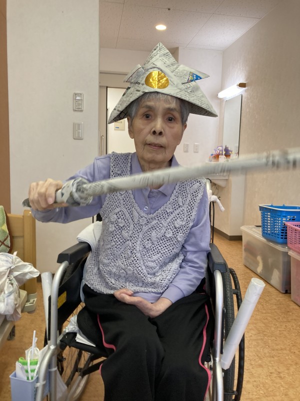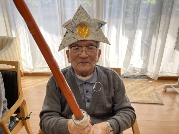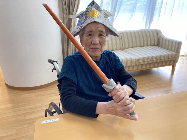 手作りの兜を身に着けて写真を撮りました(*'ω'*)