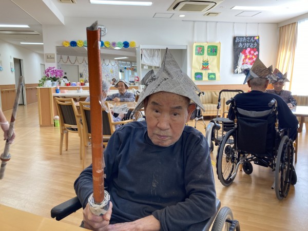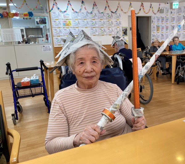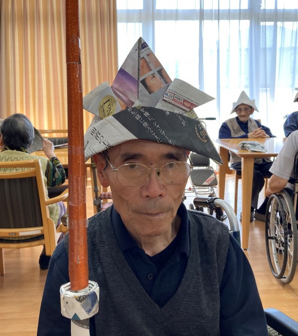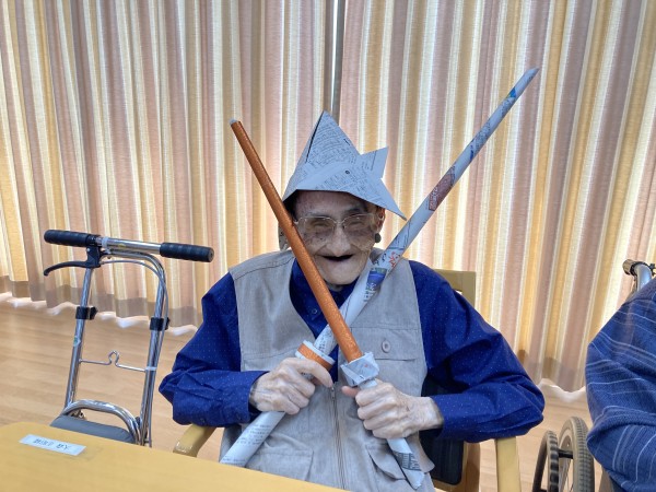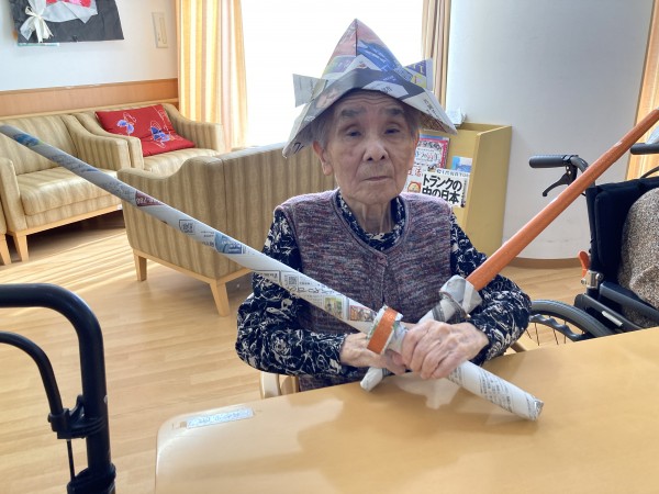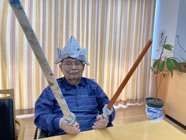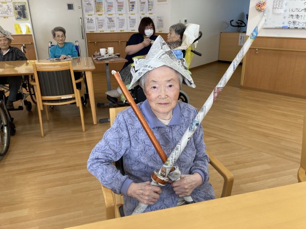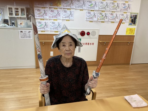 手作りの兜を身に着けて写真を撮りました(*'ω'*)