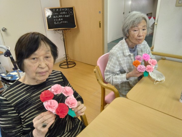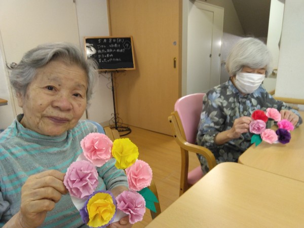 皆様たくさん悩んで完成したカーネーションリースに「この色綺麗ねー」「作れて嬉しい」「早く部屋に飾りたいわ」と大満足で笑顔がいただけた創作レクリエーションの時間でした♪