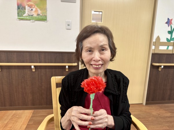 母の日でご利用者様に届きましたお花はご本人様にお届けし、更に皆様にも見ていただけるようお借りし、卓上に飾らせていただきました。