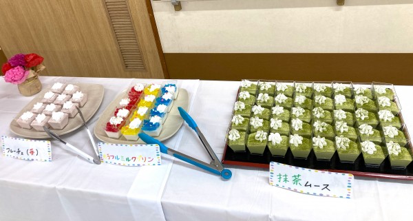 抹茶ムース・カラフルミルクプリン・フルーチェ・チョコフォンデュ