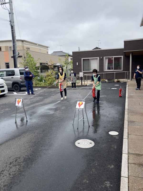 職員が屋外で、消防士さんのご指導のもと、水消火器を使って、手順通りに初期消火を行いました。