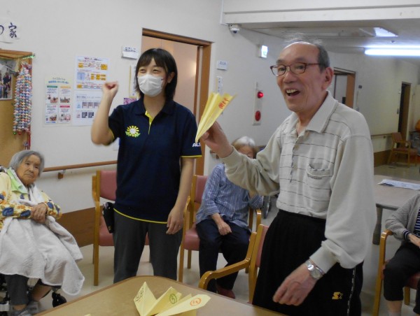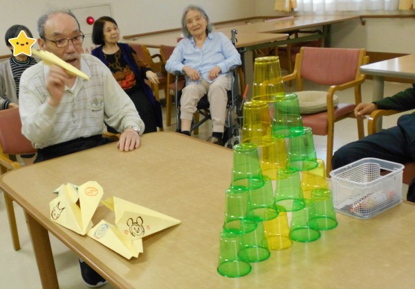 5月のレクリエーションは紙ひこうきを使ったコップ倒し、