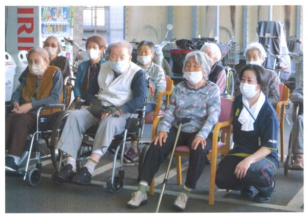 お天気にも恵まれ、さわやかな風を感じながらのレクリエーションは気分も最高ですね。職員の掛け声に合わせ様々な運動とクイズを楽しみました。外への移動もちょっとした運動、良い気分転換になりますね♪