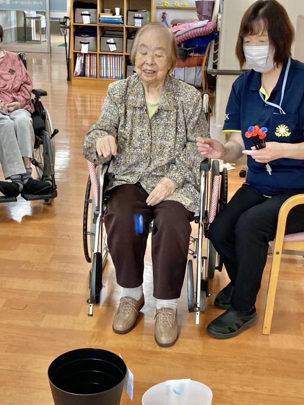 今日のレクは、投壺です。1人9投投げています。