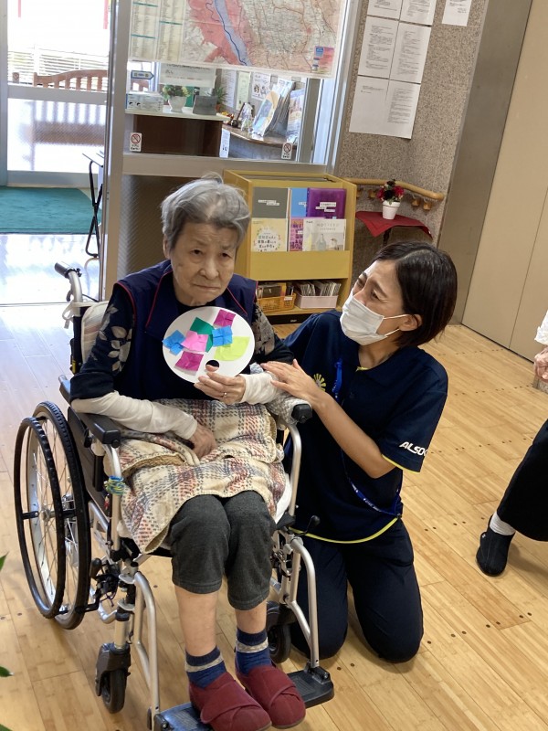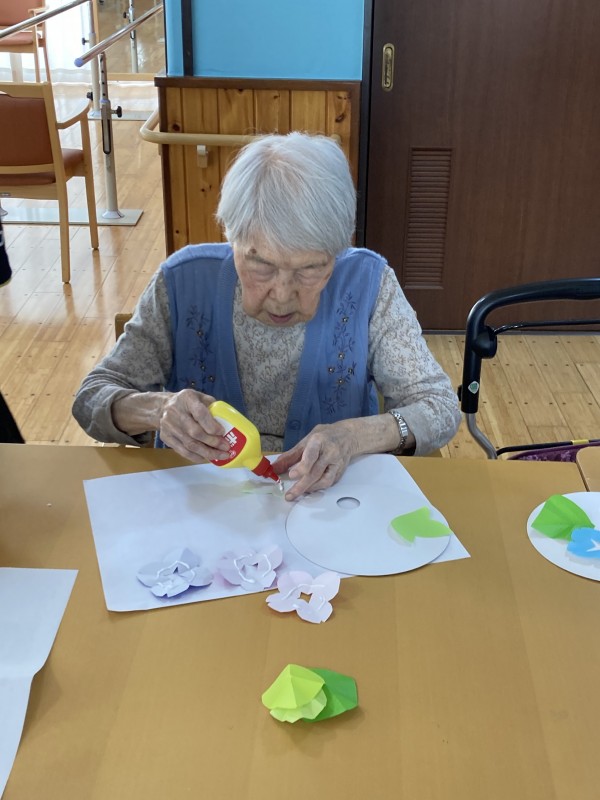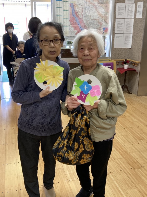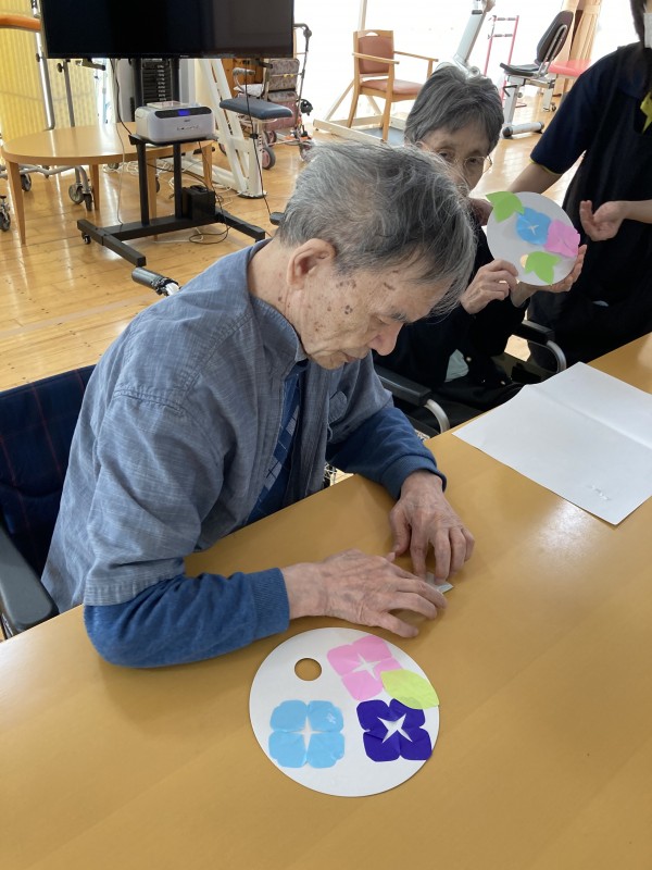 今日のレクはクラフトレク!少しづつ暑くなってきますが本格的な夏が来る前にみんなでうちわを作成しました。