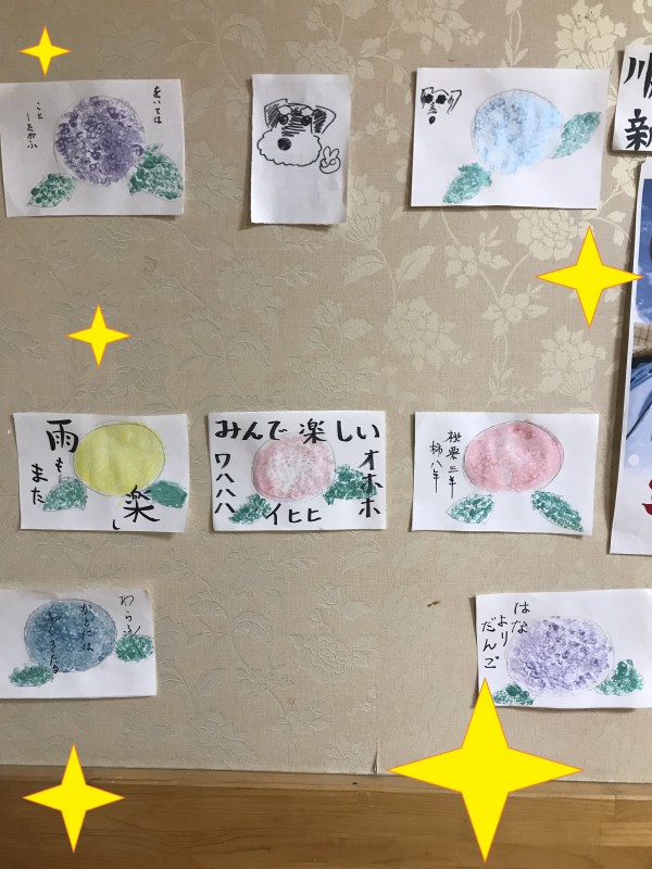 綿棒の先に絵の具を乗せて画用紙にポンポンとすると力加減で見事な濃淡ができ、紫陽花となるのです(^_-)-☆