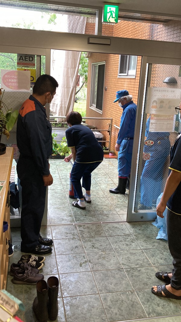 本日も雨天にて水消火器の訓練が玄関先となり分かりづらいと思われますがm(__)m。消火器を使用する際は薬剤は舞い上がるので退路を確保したうえで使用するのが大切との事です。