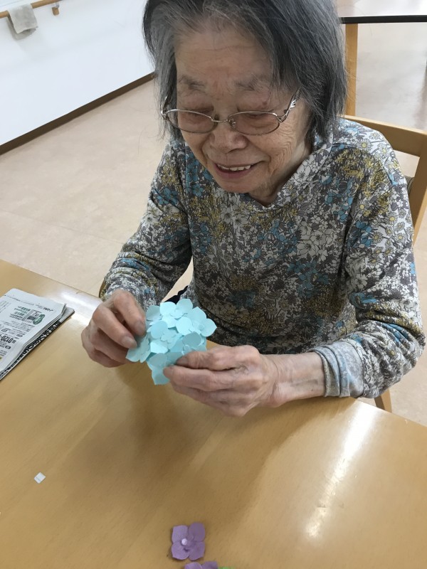 目にも鮮やかなアジサイの飾りつけを利用者のみんなと一緒に作りました。