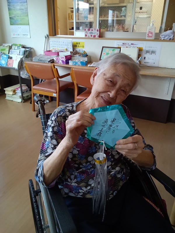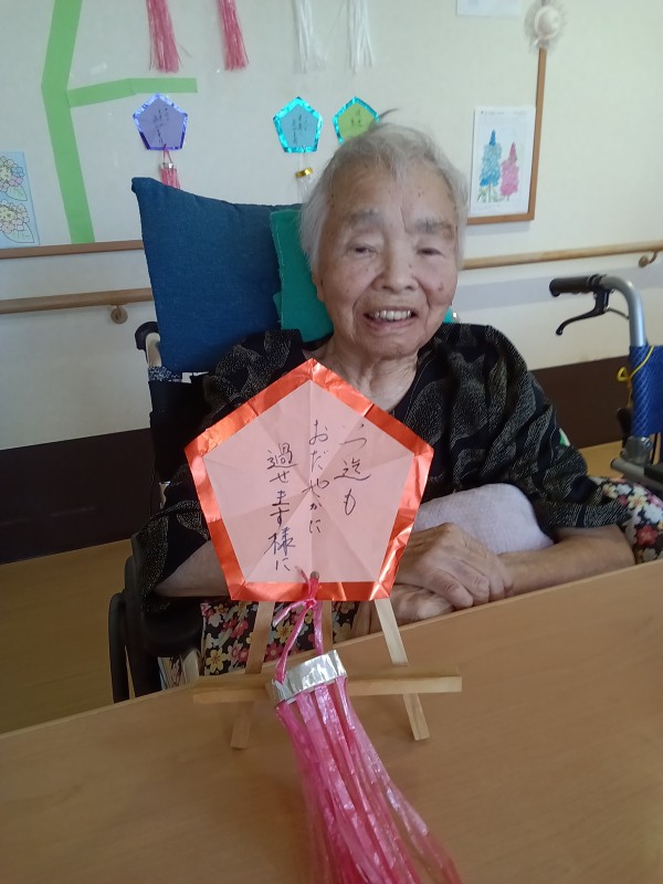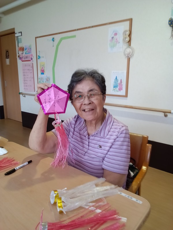 1階、2階の皆さんによる、七夕の飾りつけや短冊に願いごとをそれぞれ書いて頂きました(^_^)/まずはお2階の方々から。。。願いごとは何ですか?叶うと良いですね(≧▽≦)  ちなみに、最後の写真は七夕の日の昼食です。『天の川ご飯』だそうですww  玉子、鶏そぼろ、胡瓜の漬物、エビフライetc