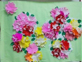 原色カラーの折り紙を、お花の形に切り抜いていきます。