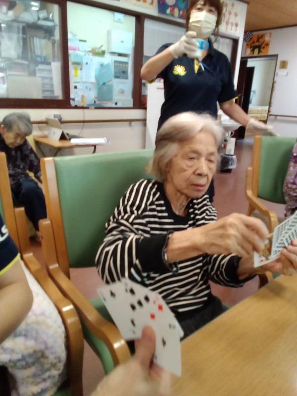 トランプやダルマ落としやボ-ル投げなど様々なゲームを通して入居者様同士・スタッフとのコミュニケーション作りを行っています