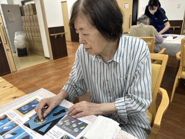 いつもと違うのは、お好きな色を使うということで、何十種類もあるオイルパステルをご利用者様の前に置き、選んでいただいたので、迷っている方や、お好きな色をすぐに手に取る方、見本を一生懸命見て選ぶ方。アドバイスをしながら職員や先生と一緒に選びました☆☆