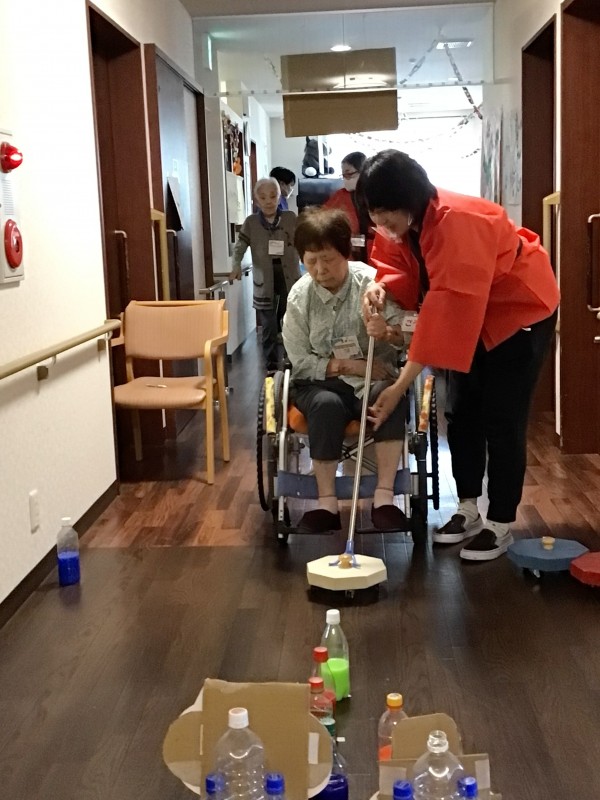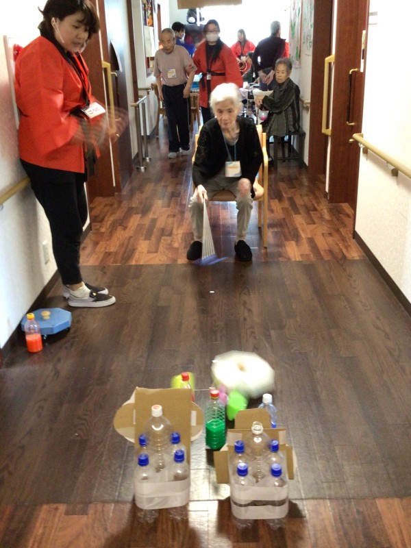 タイヤのついたカーリングを棒で押しボーリングのように並べられたピンを倒すゲームです('ω')ノ