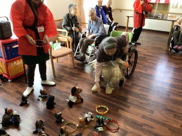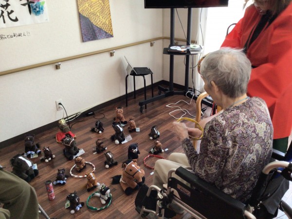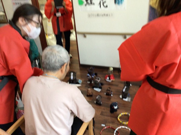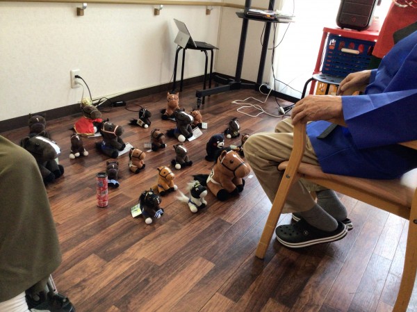 こちらは輪投げ!!スタッフが持ってきたたくさんのウマのぬいぐるみに輪がかかるように投げるルールです!(^^)!