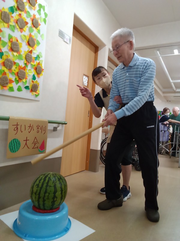 1,2,3F合同で盛大にふれあい喫茶⇒スイカ割りレクリェーションを行えて