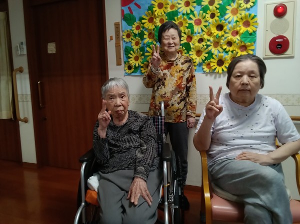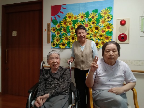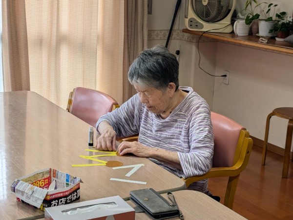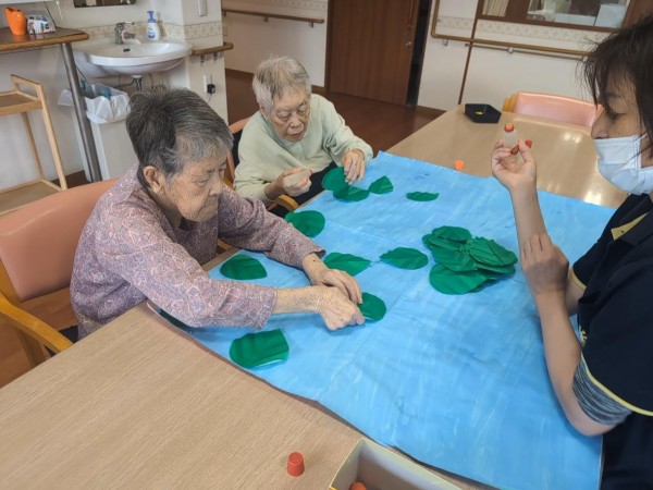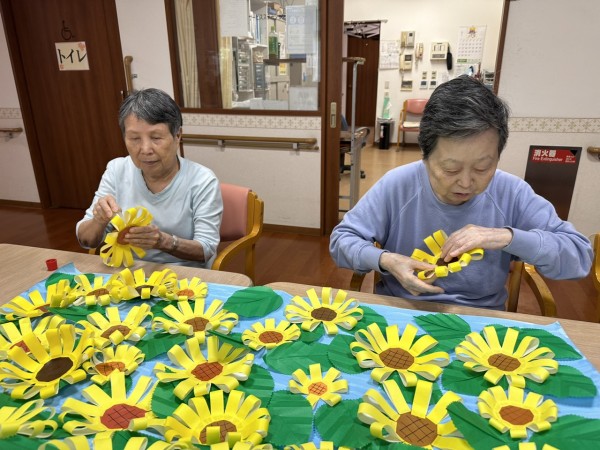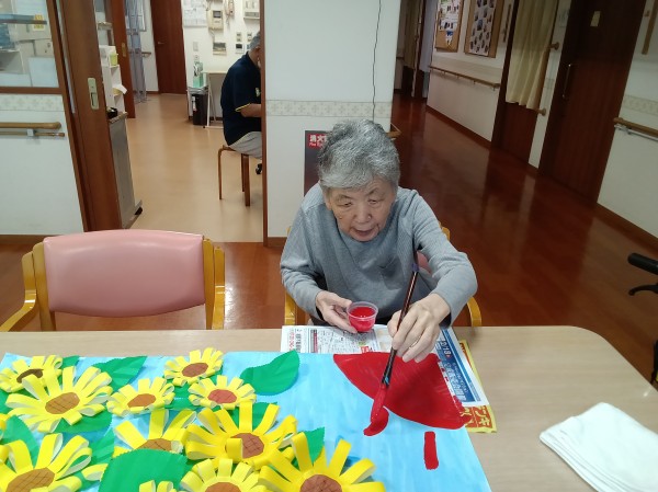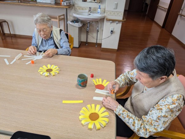 第二工程…葉の上にひまわりを貼っていただきました。その前のひまわりを作る工程では、「難しいなあ…」などと仰り、