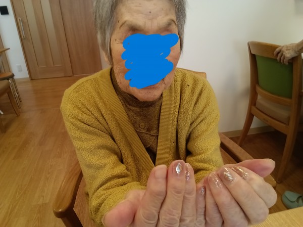爪が綺麗になり乙女のような瞳で喜んでくださいました!今までネイルなどしたことがなかったようです。職員が丁寧に爪を整えている様子を興味深そうによく見ていましたよ!やっぱり女性はいくつになっても綺麗になるとこころが弾みますね!!
