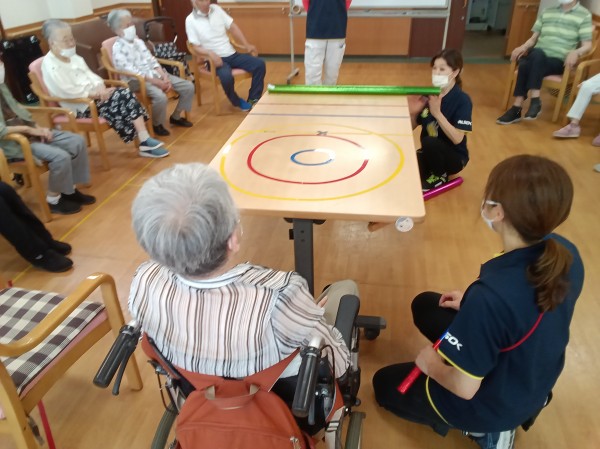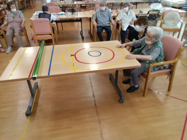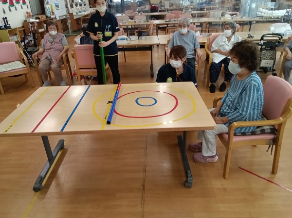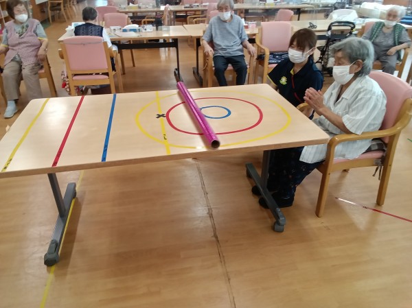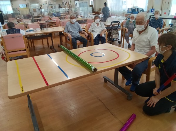 テーブルの上で棒を転がして、止まった場所で点数を競うゲームです。