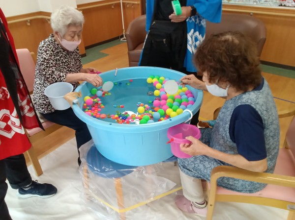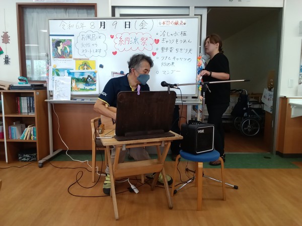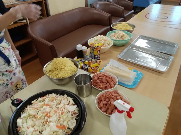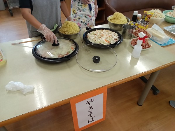 焼きそばを作る様子や、ウクレレを演奏する職員の姿。