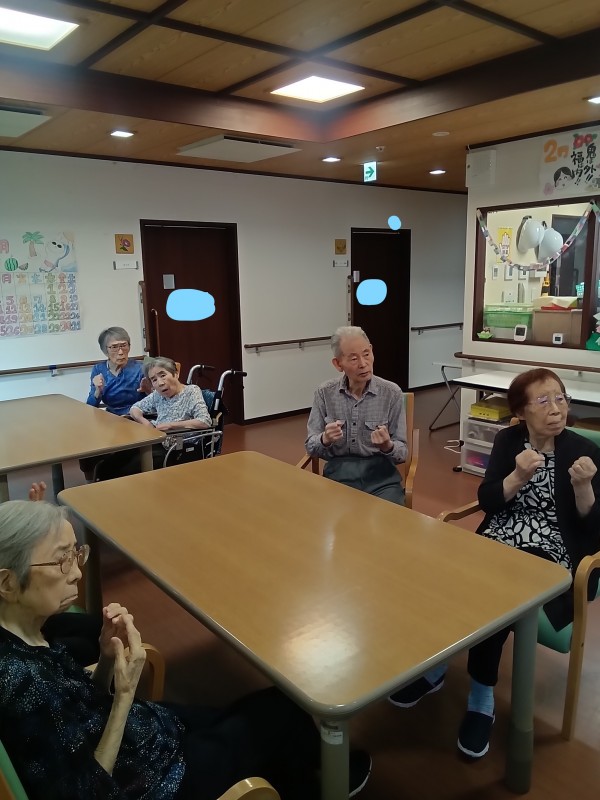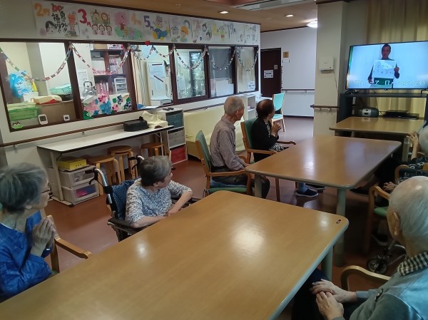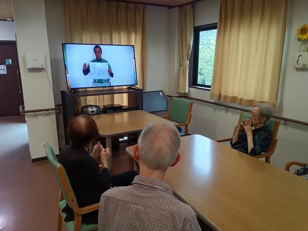 毎月リモートを含めてさまざまな体操を行っていますが、入居者様は悪戦苦闘しながらも楽しそうに参加されています