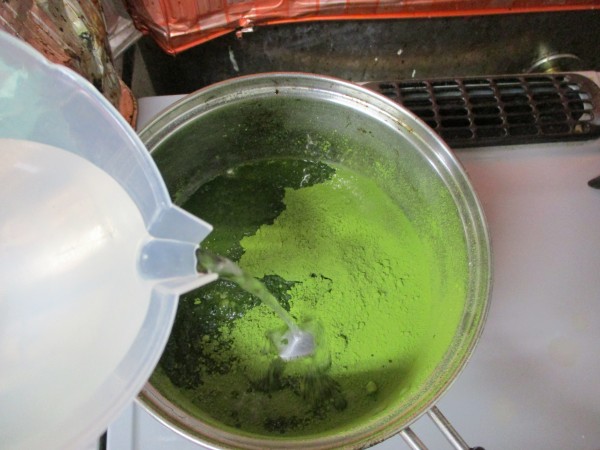①鍋に抹茶パウダーを入れ、水を少しずつ入れながら抹茶パウダーを溶かす。